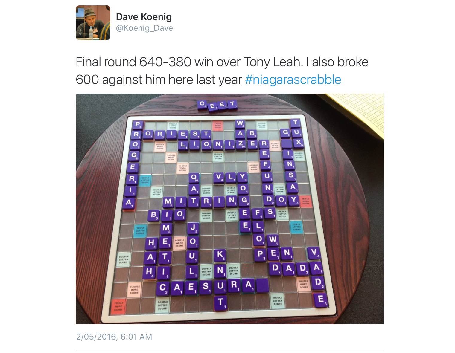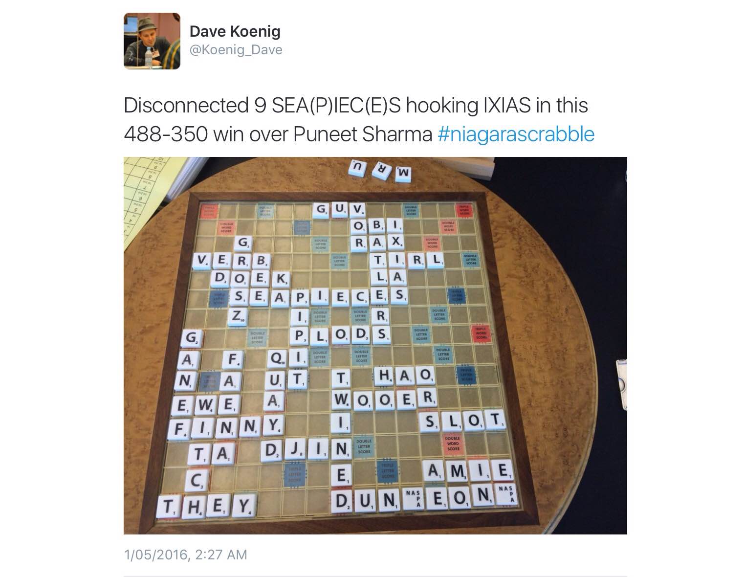 Twitter is a fascinating place to find news on Scrabble. The same Kenyan tournament featured a board photo of a 10 letter play (produced below). Coincidentally, it also provided some other highlights from our final tournament in focus this month: Niagara Falls.
